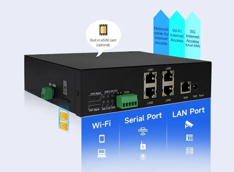 Multiple network access methods including dual SIM 5G, Ethernet,and Wi-Fi, network backup, and continuous online connectivity