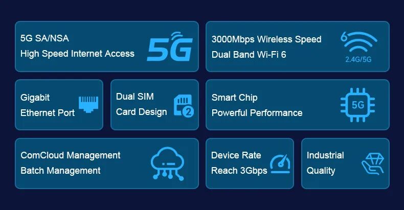 The ComIn I5100 industrial-grade 5G router is not just a network device, but a critical infrastructure for industrial digital transformation. It perfectly combines industrial-grade protection, 3000Mbps high-speed transmission, seamless multi-device connectivity, and intelligent remote management, helping enterprises reduce network failure rates by 80%, maintenance costs by 30%, and improve production efficiency.